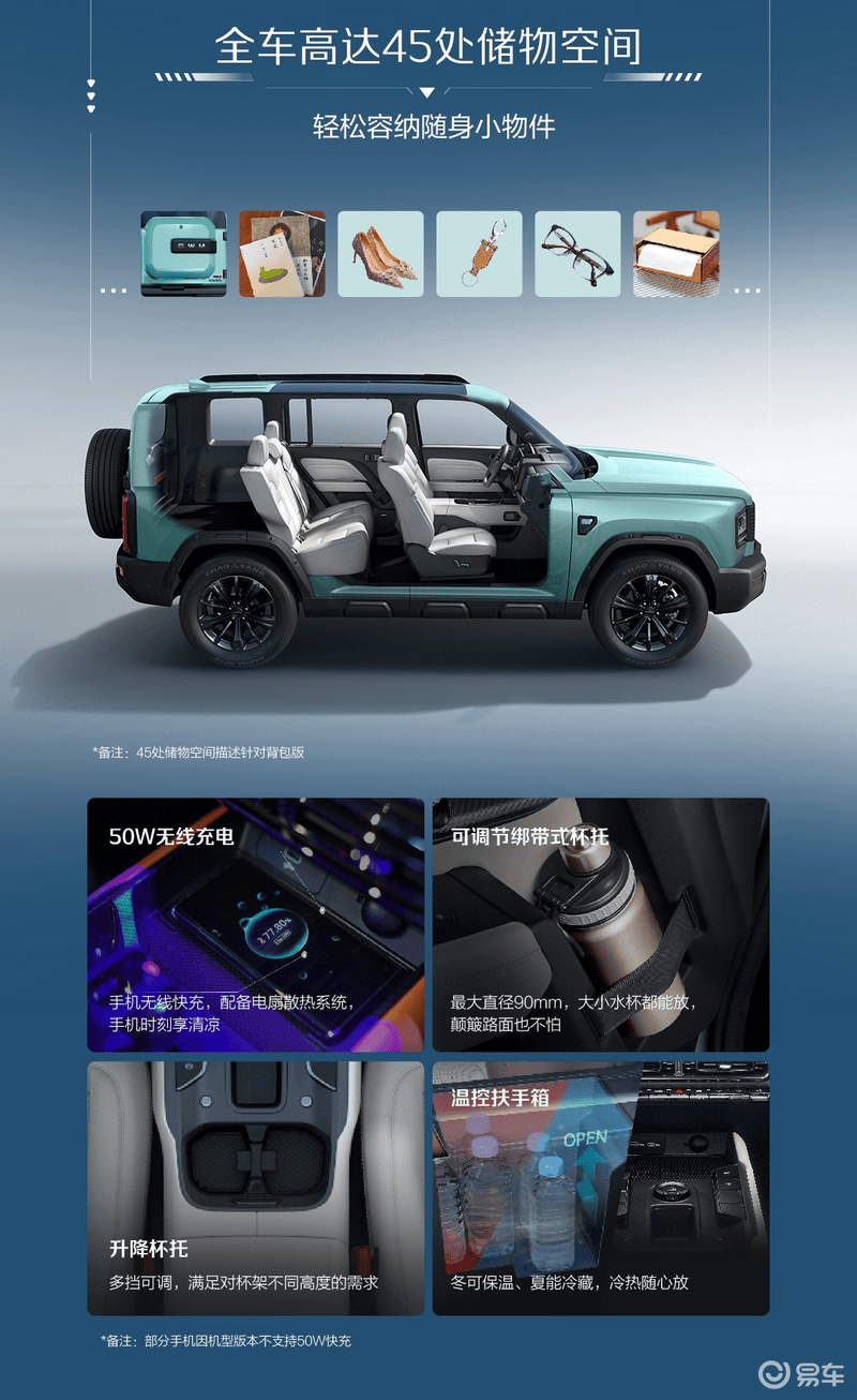 在储物空间方面,新车设计了多达45处储物空间,并配有50W无线充电、可调节绑带式杯托、升降杯托、温控扶手箱等配置。