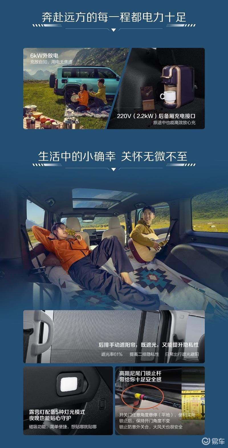 与此同时,新车还支持6kW外放电,后备厢加入了220V(2.2kW)充电接口以及露营灯等配置,用于提升车辆的实用性。