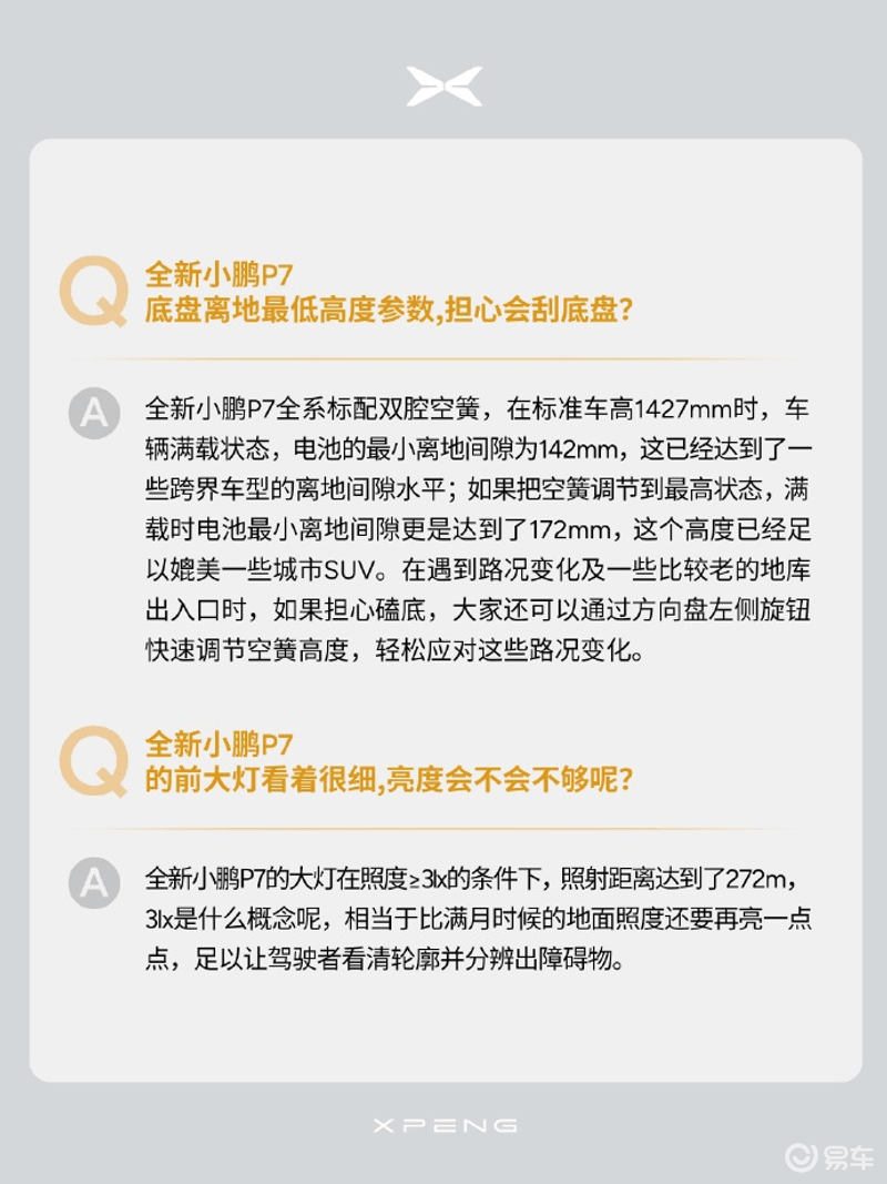 车讯 9月3日,小鹏汽车官方发布“全新小鹏P7答用户问第二期”,针对新车不同型号的电池品牌、电池技术特点、空簧耐久度如何等问题进行了解答。