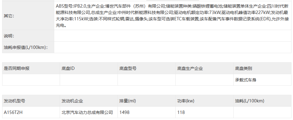 从申报信息来看,极狐N80KS搭载一套由1.5T发动机和电动机组成的增程式混合动力系统。其中,1.5T发动机最大功率为118kW,主要用于发电;驱动电机峰值功率则达227kW。电池组将采用四川时代品牌的磷酸铁锂电池组。