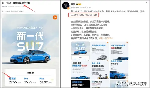 价格方面,今天小米官宣 SU7 价格时出现了乌龙,雷军微博、小米汽车官微的文案宣传的价格显示是 22.59 万元,但在官方宣传海报中却显示 22.99 万元。