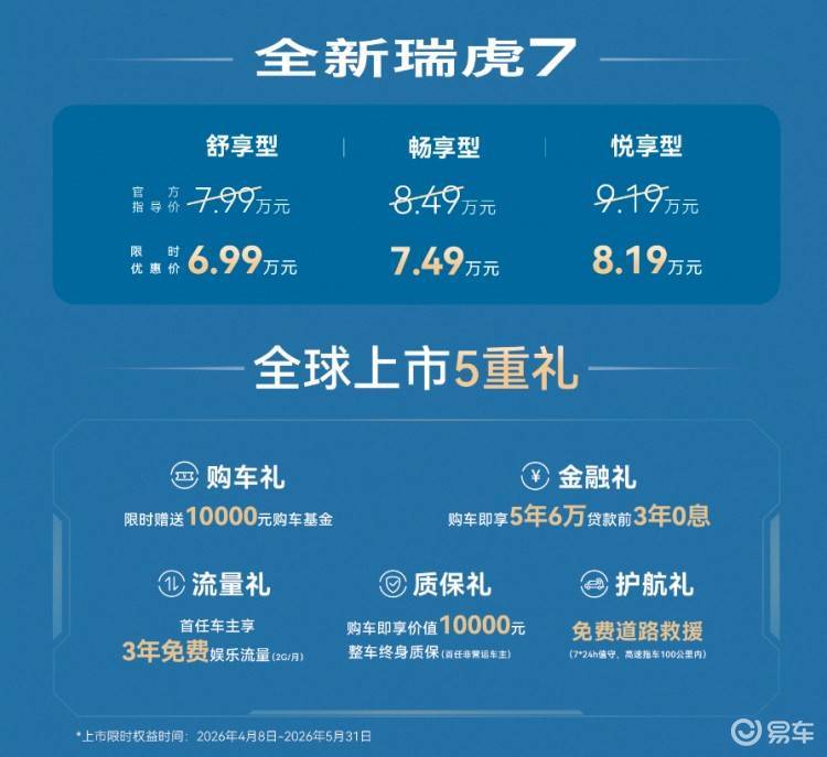 具体来看,瑞虎7L推出4款车型,官方指导价8.59-10.69万元,限时优惠价7.89-9.99万元,超值置换价7.19-8.99万元,其中包含限时交1000元抵8000元购车基金,至高1万元厂商置换补贴,2年5万0息或5年8万贷款前3年0息等购车福利;全新瑞虎7推出3款车型,官方指导价7.99-9.19万元,限时优惠价6.99-8.19万元,包含限时赠送1万元购车基金,5年6万贷款前3年0息等。