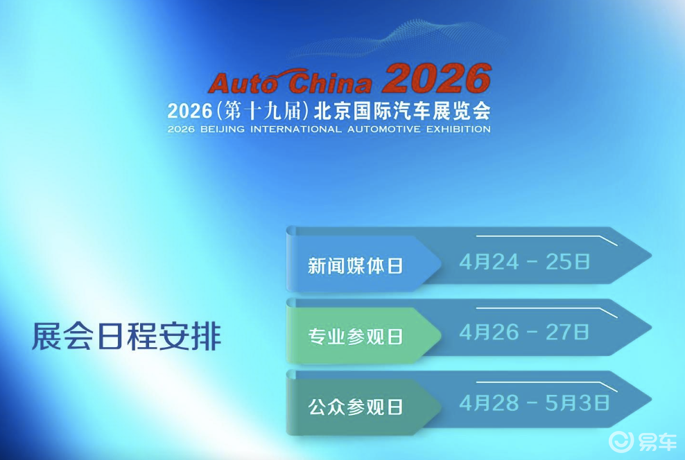 4月24日-5月3日,2026(第十九届)北京国际汽车展览会将在首都国际会展中心、中国国际展览中心(顺义馆)举行。届时,国内外头部车企将齐聚一堂,各种新技术、新产品竞相亮相,电车通(ID:dianchetong233)报道团也将亲赴现场,为大家带来一线、专业、立体的深度报道。
