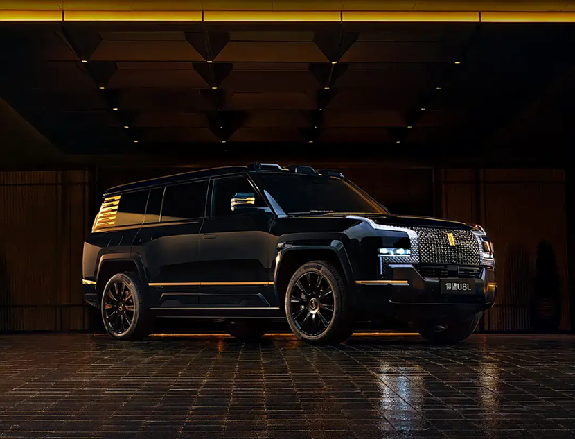 外观方面,U8L鼎世版延续了以“鼎”为灵感的设计语言,前脸配备大尺寸格栅和造型独特的灯组,品牌标识则源自甲骨文中的“电”字。值得注意的是,该车型前后车标均采用24K黄金材质打造。车身侧面装配23英寸八孔锻造轮圈,尾部取消了外挂备胎设计,保险杠造型更为简洁,整体风格更偏向商务行政用途。