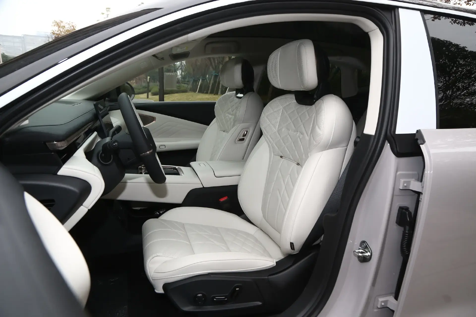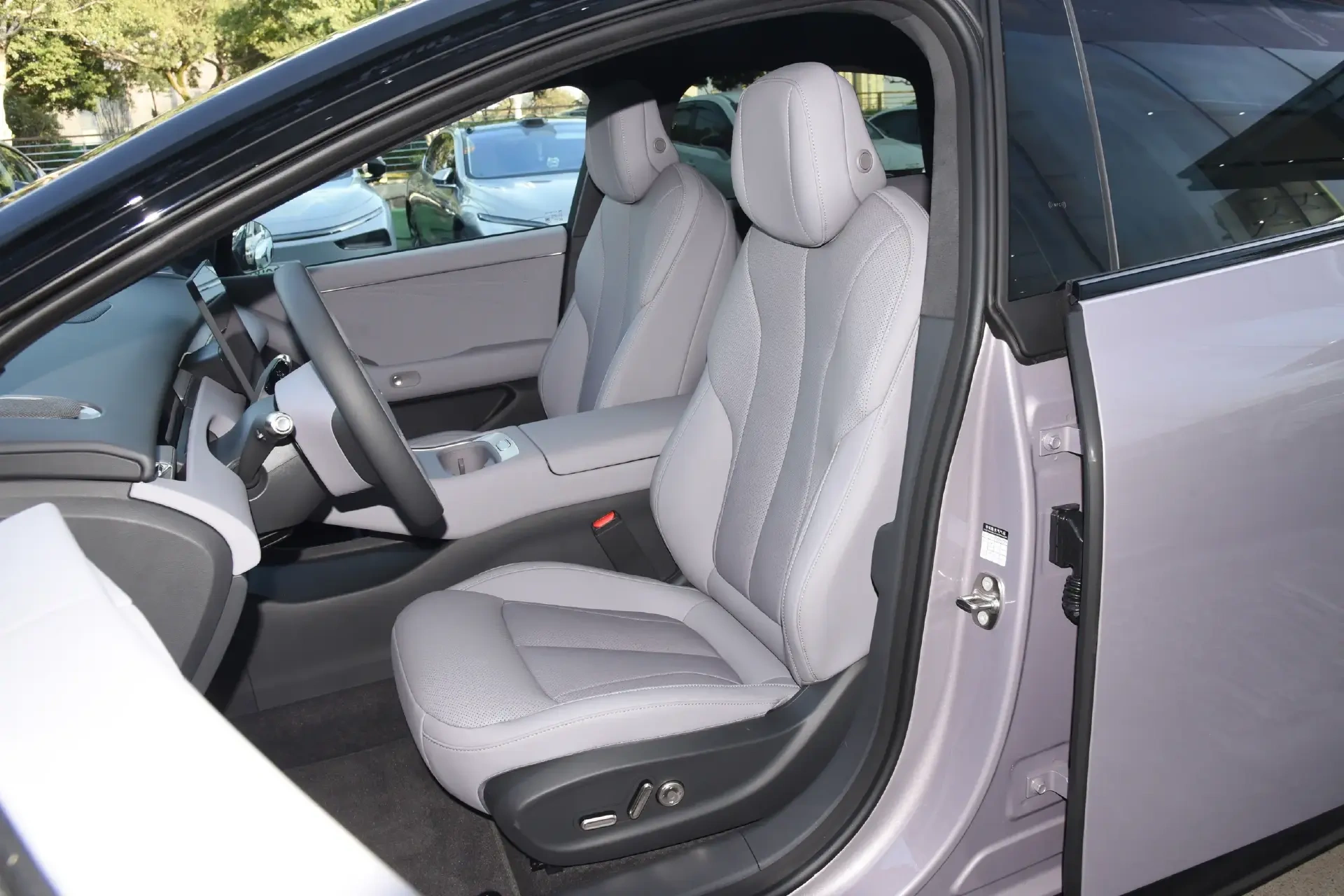 小鹏P7+则突出了年轻审美喜好,车辆的极简表达要更彻底一些。包括小尺寸出风口、抬升布局的副仪表台,还有倾斜的门板控制台等等,都是不少新势力在使用的风格。不过,舱内虽有翻毛来进行支柱与顶棚的装饰衬托,但可触区域都是仿皮材质,档次要稍弱一些。