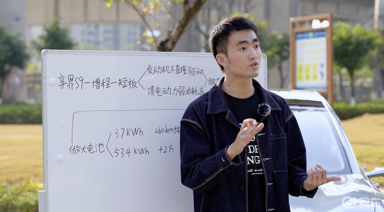为此,很多品牌给出的全新解题思路是:把电池做大,但很遗憾,入门款的2026款享界S9增程版还不在这个范畴之内,37kWh容量的电池,纯电续航只有260公里,当然啦,你也可以选装53.4kWh容量的电池,但代价是,你要多付2万元,以我们找到的这款顶配车型为例,它比入门版贵了5万,但除了续航差异以外,也只有摄像头数量、灯光功能和后排小桌板的差异,我觉得这个钱花得不值。
