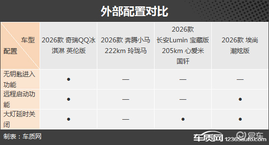 在外部配置方面,奇瑞QQ冰淇淋表现相对出色,独享无钥匙进入功能,并且配备了远程启动功能和大灯延迟关闭,实用性较强。相比之下,奔腾小马的配置缺失较多,表现不佳。