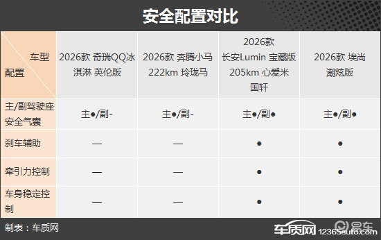 四款车型均配备了主驾驶座安全气囊,长安Lumin和埃尚还提供了副驾驶座安全气囊、刹车辅助、牵引力控制以及车身稳定控制等功能,对于车内乘客能够提供较为周全的安全防护。