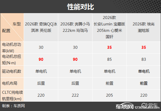 性能方面,四款车型均搭载单电机,不过电机布局有所不同,奇瑞QQ冰淇淋和奔腾小马为后置,长安Lumin和埃尚为前置。此外,四款车型的电动机总功率、总扭矩以及CLTC纯电续航里程差别不大,均能满足日常代步需求。