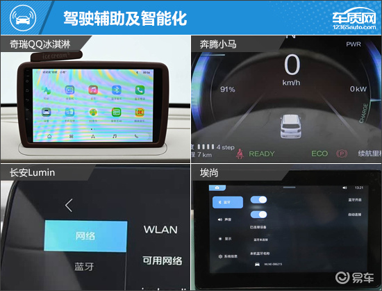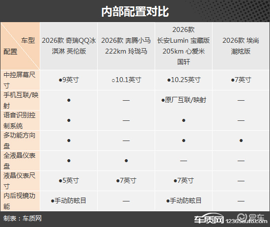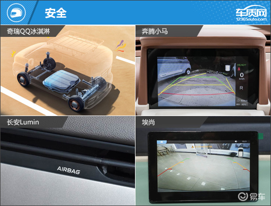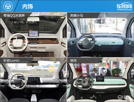 内部配置方面,奇瑞QQ冰淇淋和长安Lumin表现亮眼,多媒体中控屏内置手机互联/映射和语音识别控制系统。而奔腾小马的表现垫底,不仅未提供多功能方向盘,中控屏也需要选装才能获得。