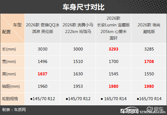 车身尺寸方面,长安Lumin在车身长度方面占有优势,奇瑞QQ冰淇淋则是车身高度表现出色,而埃尚在车身宽度上略胜一筹。轴距方面,长安Lumin与埃尚相同,均为1980mm,优于另外两款车型。
