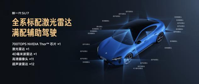 新一代SU7全系标配NVIDIA DRIVE AGX Thor™车载计算平台,算力高达700TOPS,较前代提升37.8%,采用与NVIDIA旗舰芯片同源的Blackwell架构,具备更强的并行计算与深度学习能力,支持更高速数据传输与多样化连接,配合高性能DDR缓存,显著提升系统响应速度与决策效率。在感知硬件方面,全系标配1个激光雷达、1个4D毫米波雷达、11个高清摄像头、12个超声波雷达。